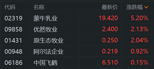 港股乳制品股普涨蒙牛乳业绩后涨约6%领衔优然牧业、原生态牧业