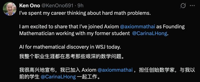 熊猫体育直播【新智元导读】传奇数学家Ken Ono辞去了弗吉尼亚大学终身教职,加入了自己学生Carina Hong创办的Axiom Math,打造「AI数学家」。促使他做出这一决定的,只因他在一次研讨会上看到了AI在数...